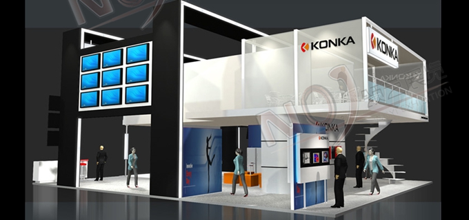 契合康佳的品牌形象和產(chǎn)品特性,采用框型結(jié)構(gòu),再搭配燈具燈光的效果,襯托出展位簡(jiǎn)約、舒適的氛圍,突出一種躍動(dòng)、簡(jiǎn)約的時(shí)尚品味。