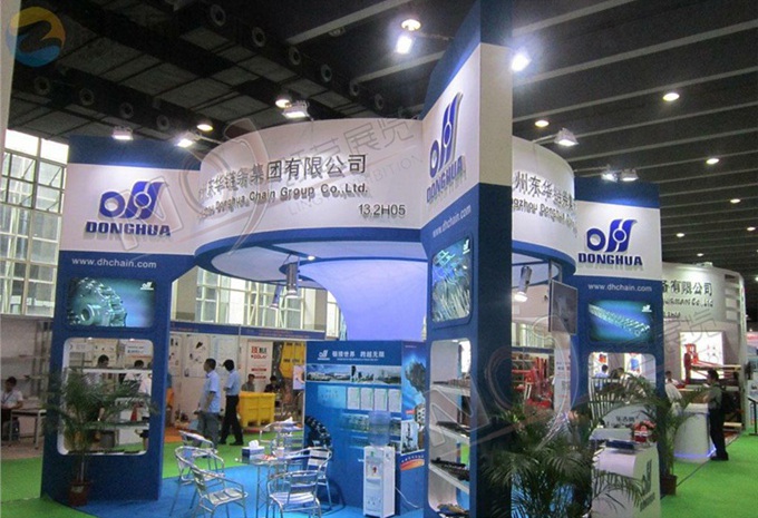 契合東華鏈條的品牌形象和產(chǎn)品特性,采用矩形結(jié)構(gòu),再搭配燈具燈光的效果,襯托出展位高端、時尚的氛圍,突出一種現(xiàn)代、大氣的時尚品味。